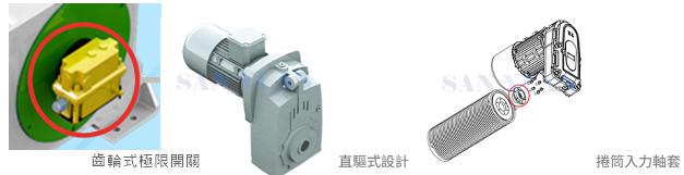 ► 適用於捲揚應用,直接於捲筒上,透過減速齒輪組觸碰微動開關而達到限位功效。