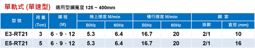 低舉型 (低淨空) 單軌式鋼索吊車 E-RT