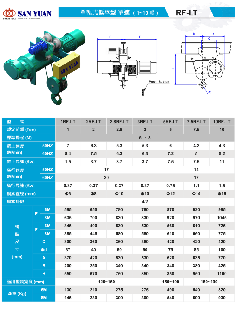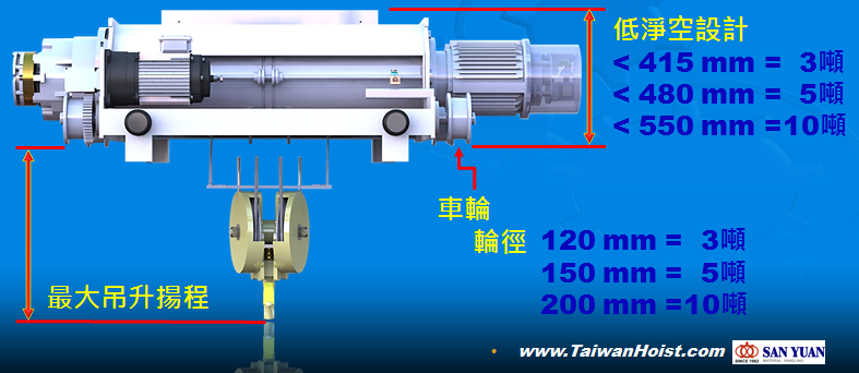 SAN YUAN 三園  三元 電動鋼索吊車, 天車, 起重機,雙軌 單速型 (RF-DT & RS-DT)