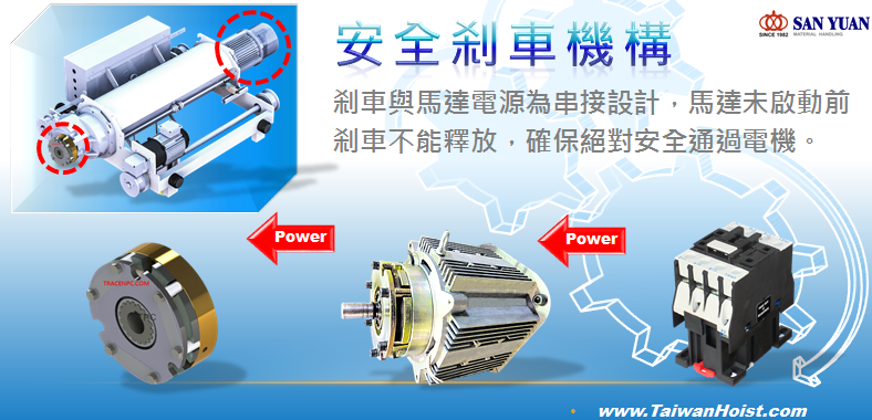 選購 – 電磁式輔助安全剎車,當馬達未通電不允許此剎車開啟,確保安全無慮。