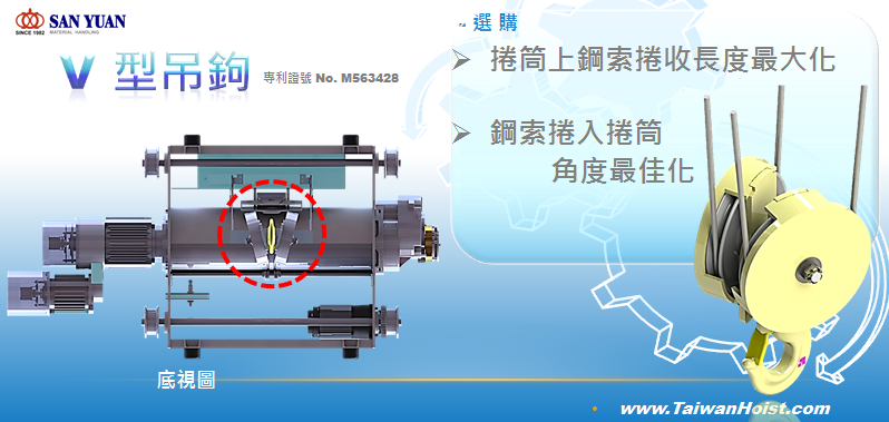 • 選購 – V型吊鉤 : 使捲筒可收納鋼索長度增加,並使鋼索捲入捲筒角度最佳化。