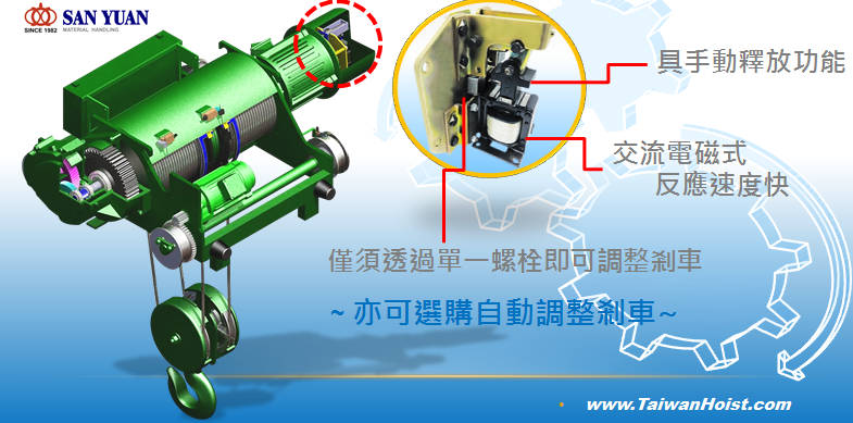 • 主吊剎車採用 AC 交流電磁式,反應速度優於 DC 直流式。