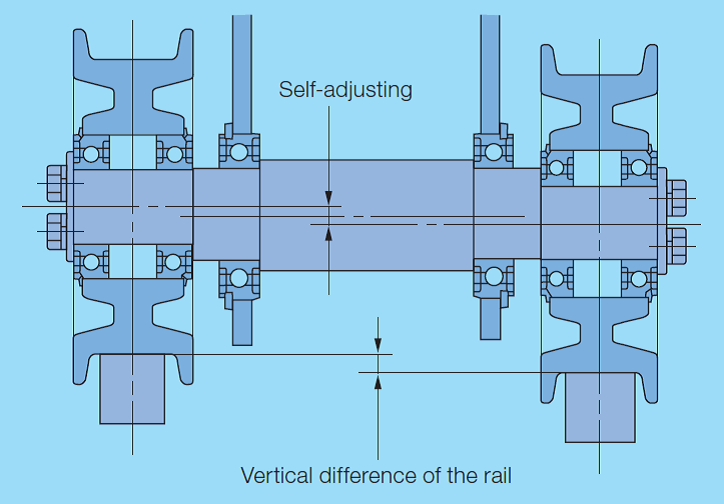 雙軌式滑車 – 自動調心  從動台車軸偏心允許設計,克服軌道鋪設誤差。