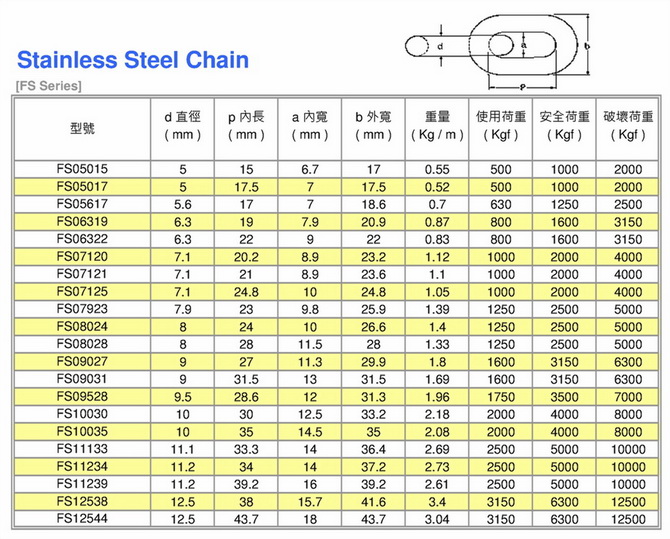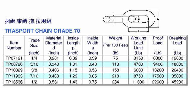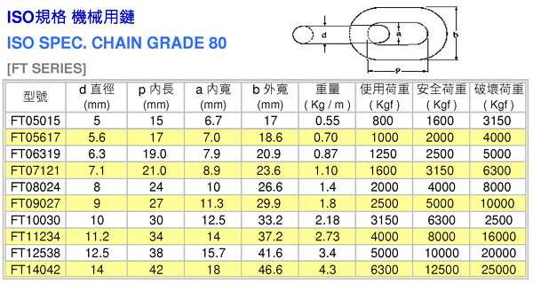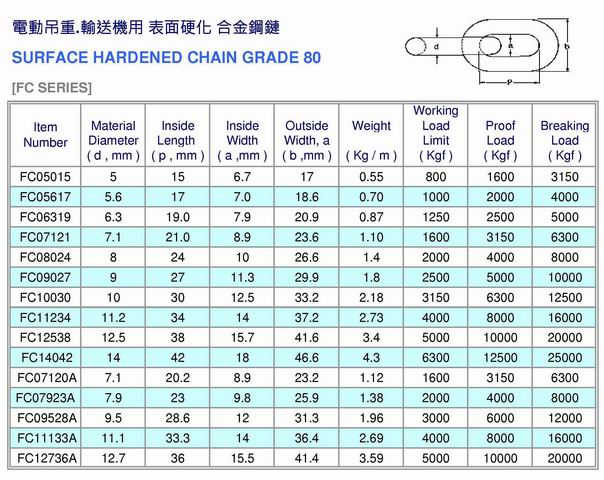 工業用各式鏈條 ► 電動吊車 & 輸送機用 & 表面硬化 & 合金鋼鏈 [ FC Series ] ► ISO 規格機械用鏈條 FEC JAPAN [ FT SERIES ] ► 不鏽鋼鏈 FEC JAPAN ► 捆綁 & 束縛 & 拖 & 拉用鏈 ► 鏈條 G80 LIFTING GHAIN ( EN818-2 )