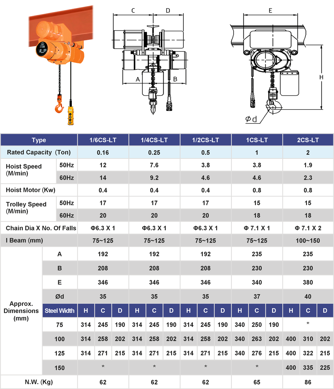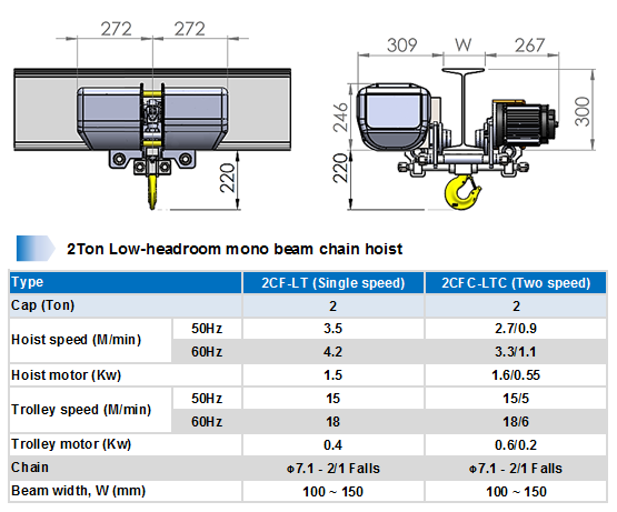 ► 2-ton low-lift electric chain crane (single speed) – Outline dimensions 2CF-LT