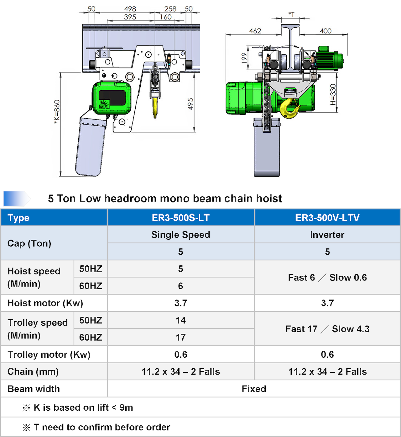 ► 5-ton low-lift electric chain crane (single speed) outline drawing ER3-500S-LT