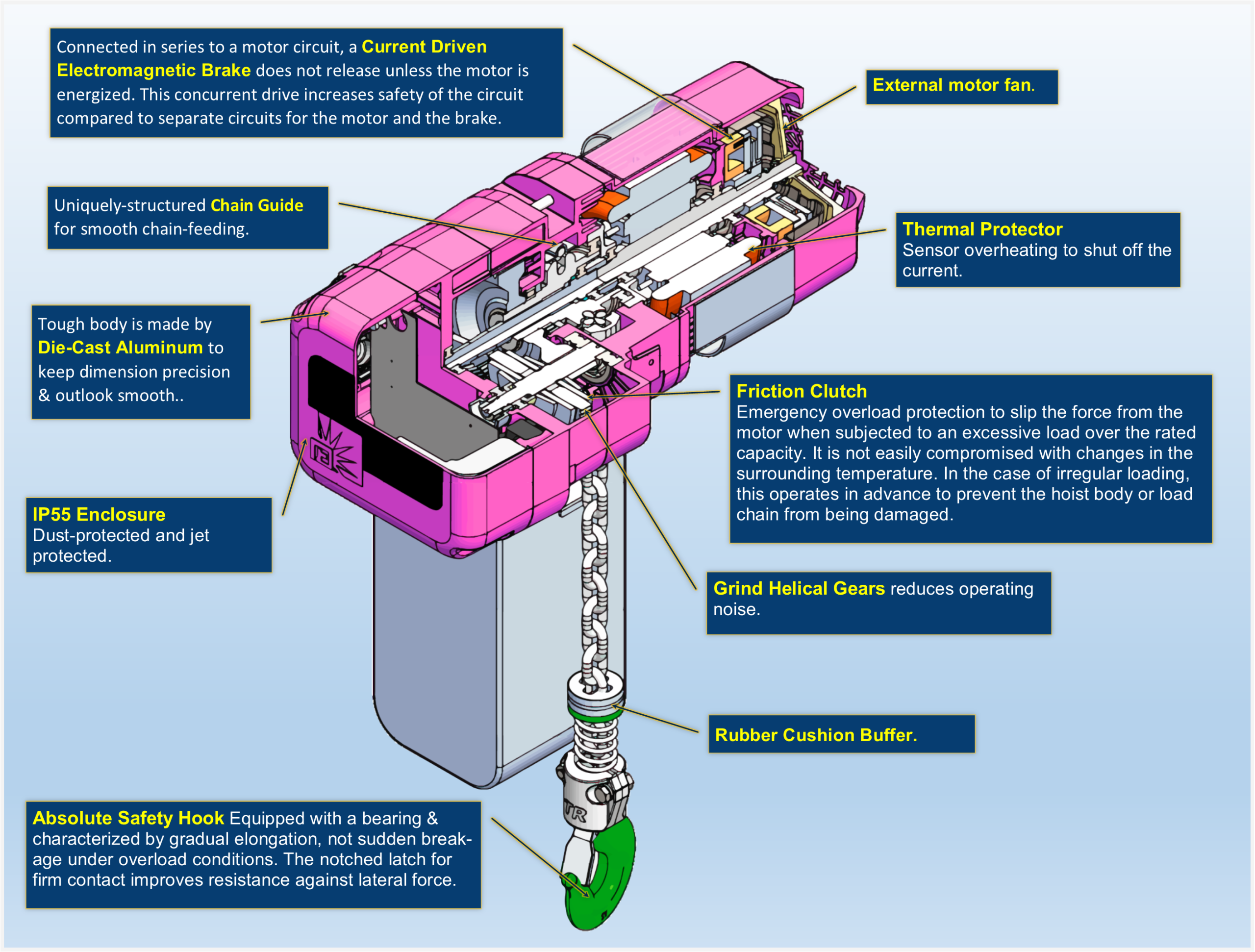 - Motor overheat protection – In case of motor overheating, it will only perform the load lowering function, ensuring the motor does not burn out and increasing the life of coils and bearings.