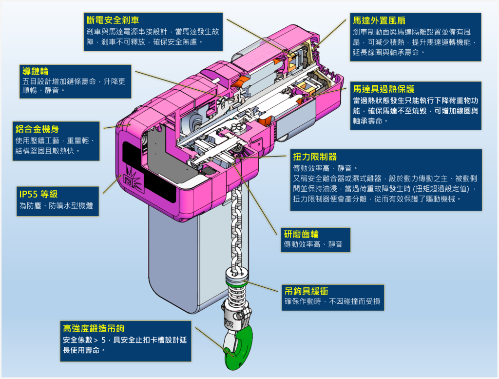 - 導鏈器、導鏈滾輪、極限裝置…可直接由主機下方拆卸,保養維護、檢修容易。